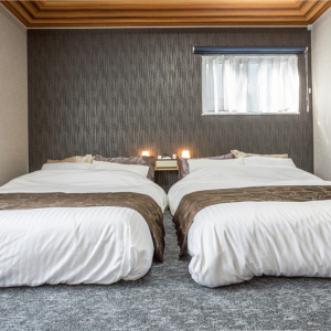 足元に柔らかな間接照明を配した、ツインダブルベッド仕様のメインベッドルームをご用意いたしました。