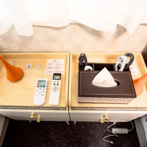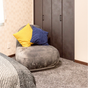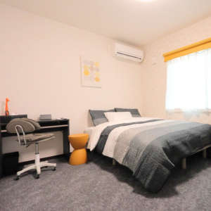 シンプルなカラーを基調とした、ワークデスクを備えました。一人掛けチェアはコーデュロイ素材で、しっとりとした座り心地をお楽しみいただけます。さらに厚さ25cmのダブルサイズのマットレスを備え、他のベッドルームよりも贅沢な空間をご用意いたしました。